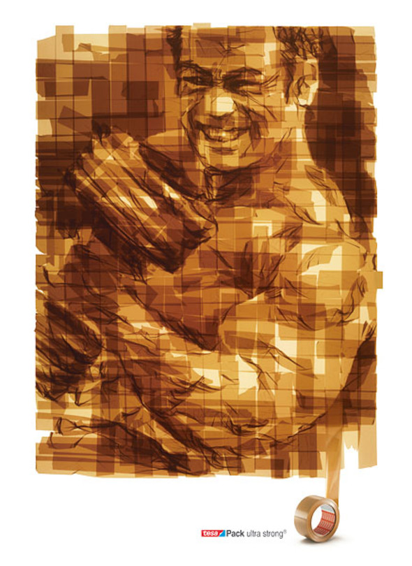 In dieser Kampagne für Tesapack wird das künstlerische Potenzial des Alltagproduktes gezeigt. Die besondere Stärke von Tesapack Ultra Strong wird mit Motiven verdeutlicht, die für Kraft stehen: ein Boxer, ein Sumo-Ringer und ein Bodybuilder.