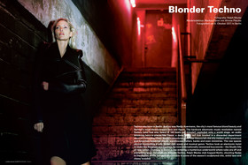 Techno was born in Berlin. And so was Nadja Auermann, the city’s most famous blond beauty and Helmut’s most Newtonesque face and figure. The hardcore electronic music revolution named Techno (who had ever heard of 140 beats per minute?) exploded onto a world stage, an audio blitzkrieg born in places like Tresor, a dank, blood red club located in a discarded department store on Potsdamer Platz. Berlin’s convoluted post-War history left the city riddled with cavernous and forgotten industrial plants, warehouses, cellars, banks and even ministries. The raw spaces almost demanding a new darker club scene and musical genre. Techno took an electronic twist in clubs like Berghain and Cookies, by now internationally renowned buzzwords – the Studio 54s of rave nation. Clubbing in Berlin is like entering a mysterious underworld where rules are off and everything goes. To celebrate Blonder Techno, Ralph Mecke club hopped Berlin, shooting Nadja in the depths of this subversive eroticism in some of the season’s sculptured chic, sinful lace and classy tuxedos.