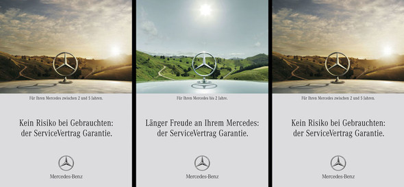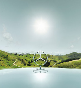 Three different periods of guarantee had been visualized with matching positions of the sun and the respective time of the day. All three positions of the sun had been placed into the same narrow cutout of the image in an elaborate post-simulation-process. In reality this image could not have been photographed. The reflections and the shading of and on the engine hood and the Mercedes Benz Star had been generated via CGI